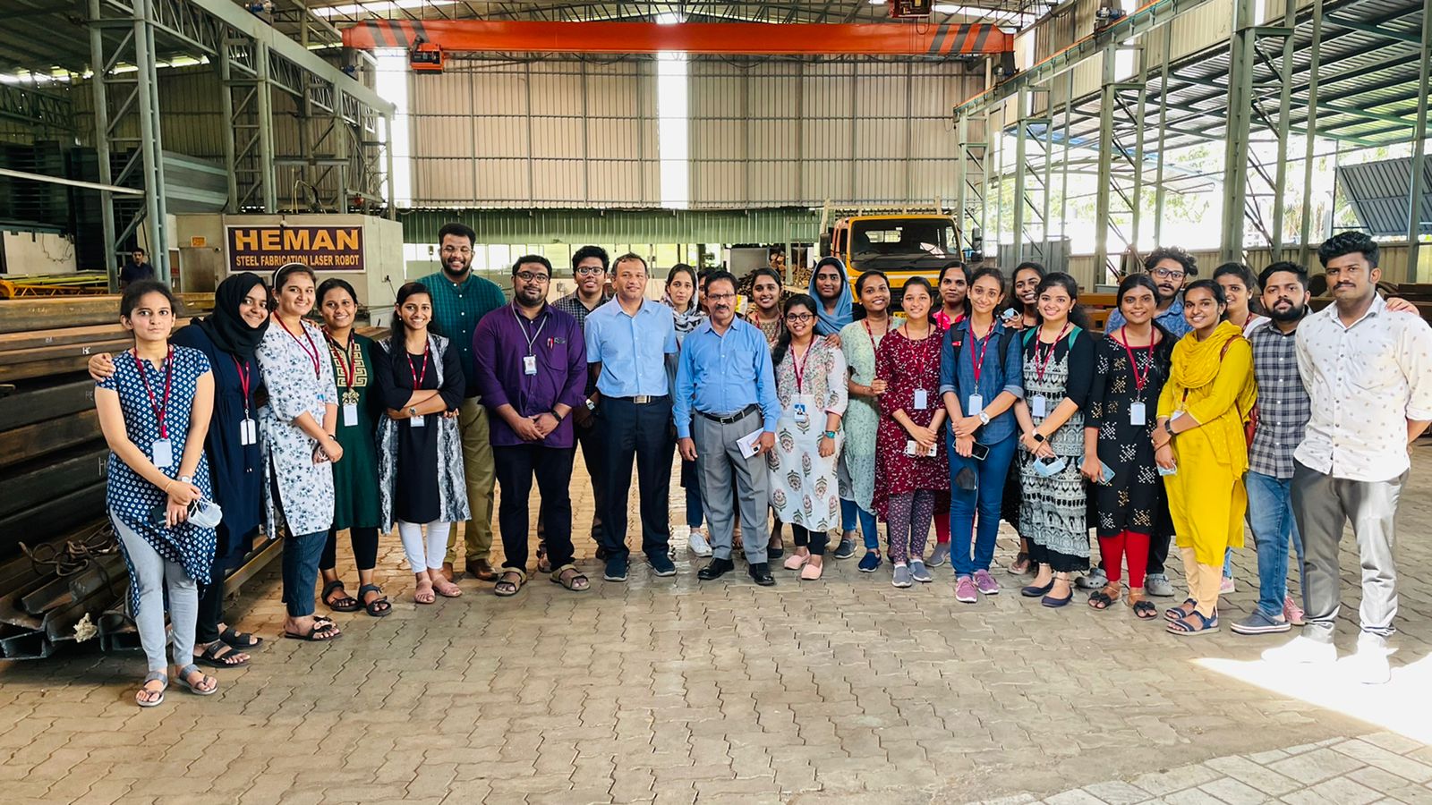 Classroom learning should always be supplemented with practical knowledge - this is proven beyond doubt in Engineering, especially for subjects like Design of Structures. The third semester M.Tech Structural Engineering and Construction Management students from our campus made an Industrial Visit to He-man Steel Fabrication Unit at Mookkannoor on 28 Sep 2022. He-Man is well know for their robotic parking system, they have patented the technology and is one of largest steel fabrication units in the state. They undertake very large projects including Robotic parking systems, Prefabricated steel structures, Industrial Buildings, Steel Brides and so on. This visit was arranged as part of the course Design of Advanced Steel Structures, an elective offered in the third semester. The course is very practical oriented and involves design of gantry girders, industrial buildings, cold formed structures, towers, masts, brides etc.